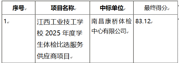 江西工业技工学校2025年度学生体检比选服务供应商项目,通过公开对外招标,经评审人及监督人员查看投标的文件,在满足招标公告评分标准要求下,根据综合评价原则得分最高的中标,现将中标结果公告如下: